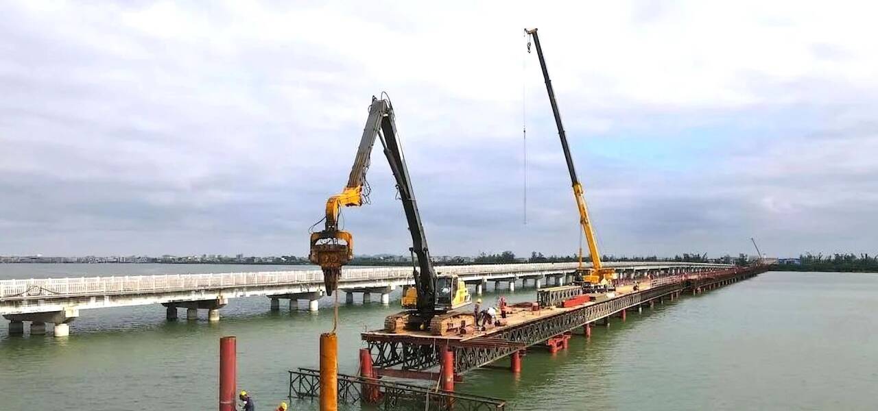环新英湾快速干道新州特大桥坐落儋州市新州镇蓝田村与英进村之间的海域。施工便桥作为桥梁建造过程中至关重要的暂时通道,将为后续桥体施工供给人员、设备及资料运送保证。
